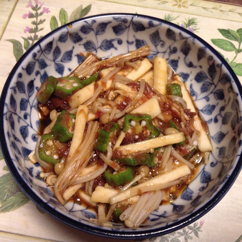 おひたし風はだし汁:醤油:みりん=8:1:1を混ぜ合わせて、軽く湯がいたオクラとえのき茸、山芋を和えて、とろろ昆布をトッピング。