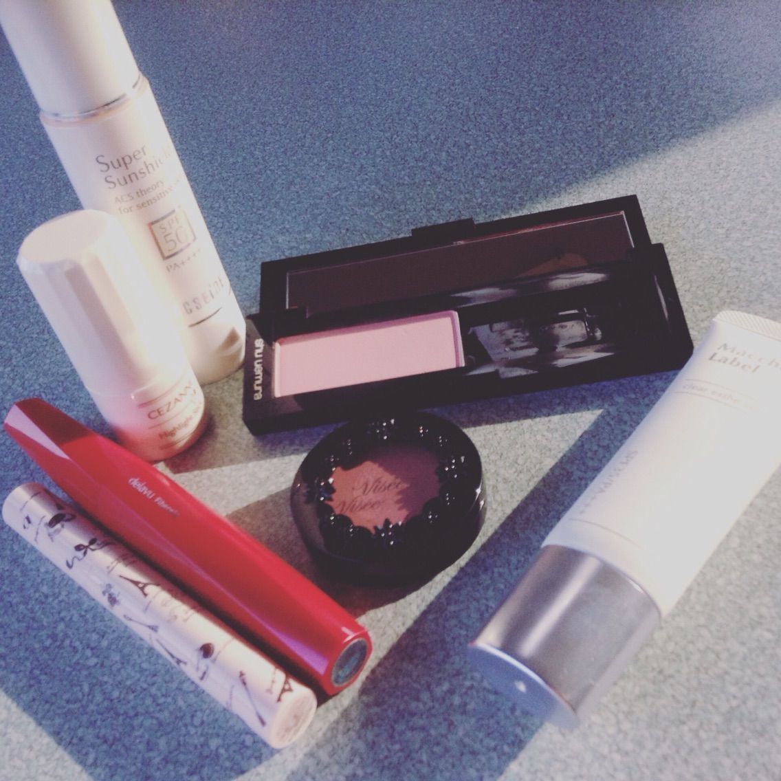 ベースメイクは下地にアクセーヌスーパーサンシールド 、ファンデはマキアレイベル 。パウダーはRMKのプレストパウダーN(P)01を薄く。