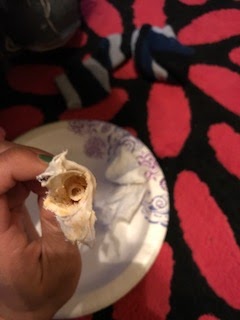 しかし逆さにすると何かがポロポロ落ちてきます。そしてハサミで開けると塊が。。
