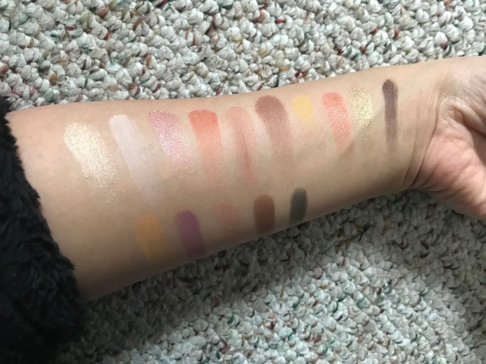 スウォッチしてみました。かなり柔らかいテクスチャーで伸びも発色も良いです!濃いオレンジ目当てで買いましたが、その右隣のベージュ色も気に入ったし、シマーカラーもかなり使えそうで満足です。